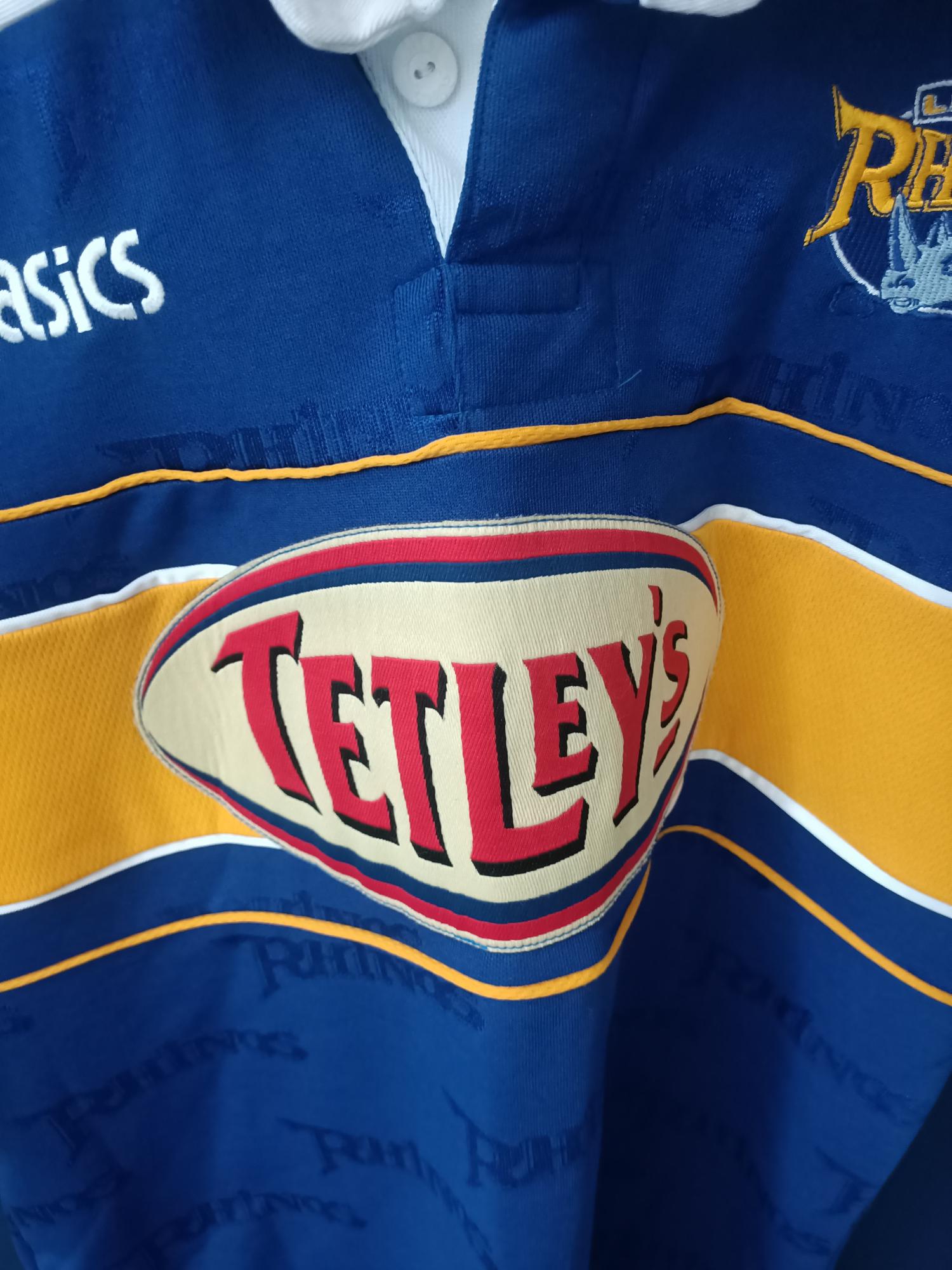 Relive the resilient 2000 season of Leeds Rhinos with this authentic home shirt, a vintage treasure from the year the Loiners finished fourth in Super League V, reached the play-off semi-finals, and battled to the Challenge Cup Final at Murrayfield, ultimately falling to Bradford but showcasing their fighting spirit. Manufactured by ASICS in durable 100% polyester, this jersey features a classic blue base with bold amber accents, including a striking V-neck collar and sleeve details, capturing the essence of early 2000s rugby league style. Proudly displaying the Tetley's sponsor logo front and center, it's a nod to an era of growth and determination for the club.