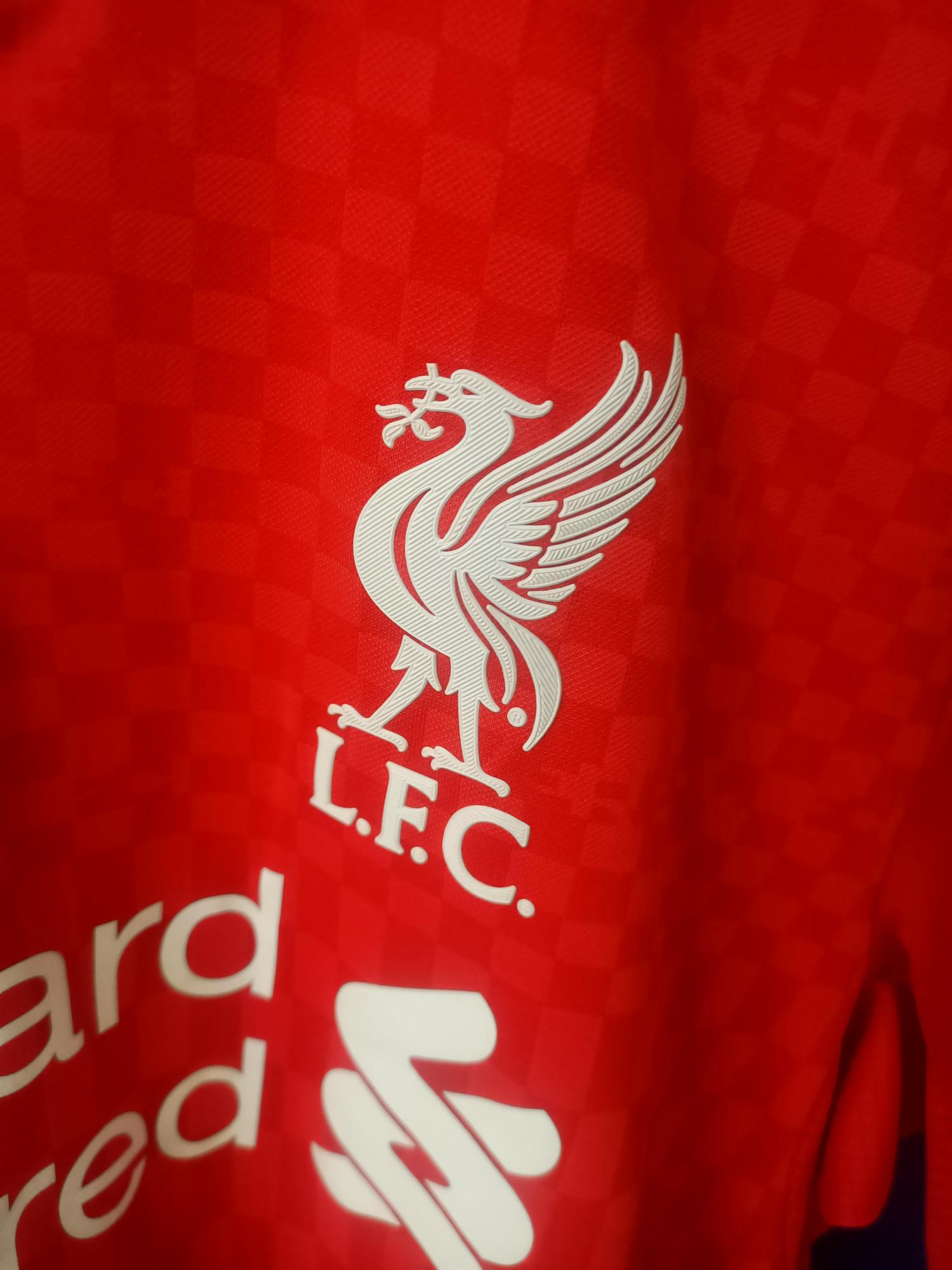 - Details: Embroidered Liver Bird crest in gold/white/black, official Premier League sleeve patches (both arms), LFC crest heat-pressed on the nape.