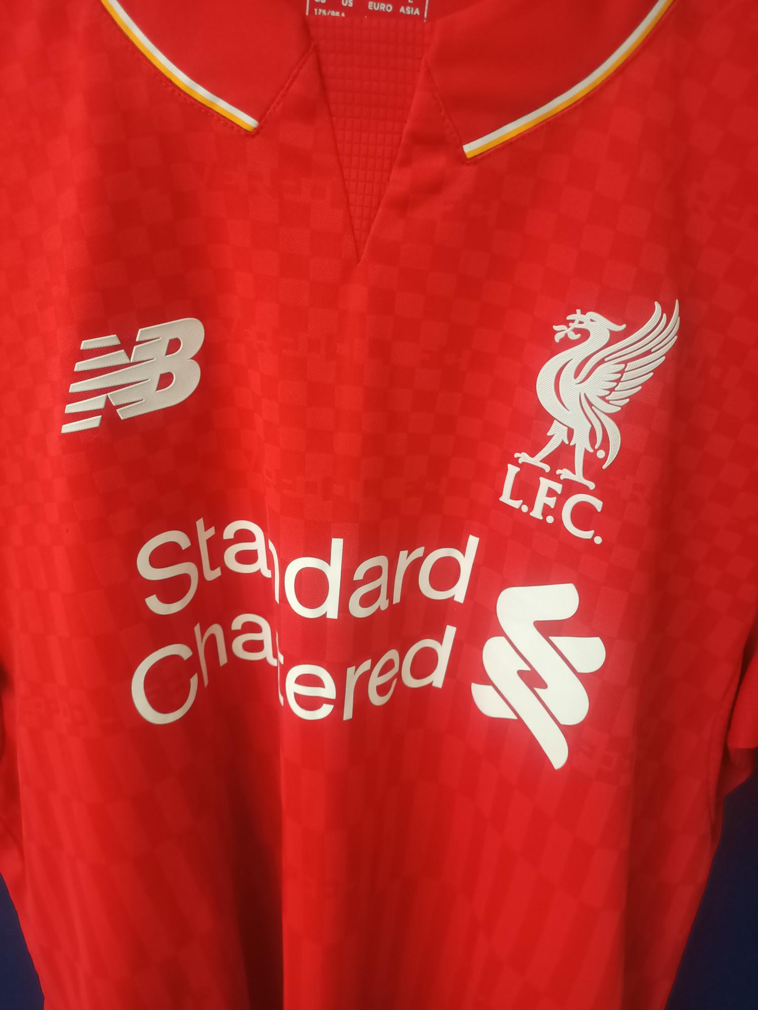 - Design: Iconic LFC red with subtle black pinstripe shadow effect, crisp white New Balance logo, and gold Standard Chartered sponsor. Clean collar, timeless silhouette – pure Klopp-era fire.