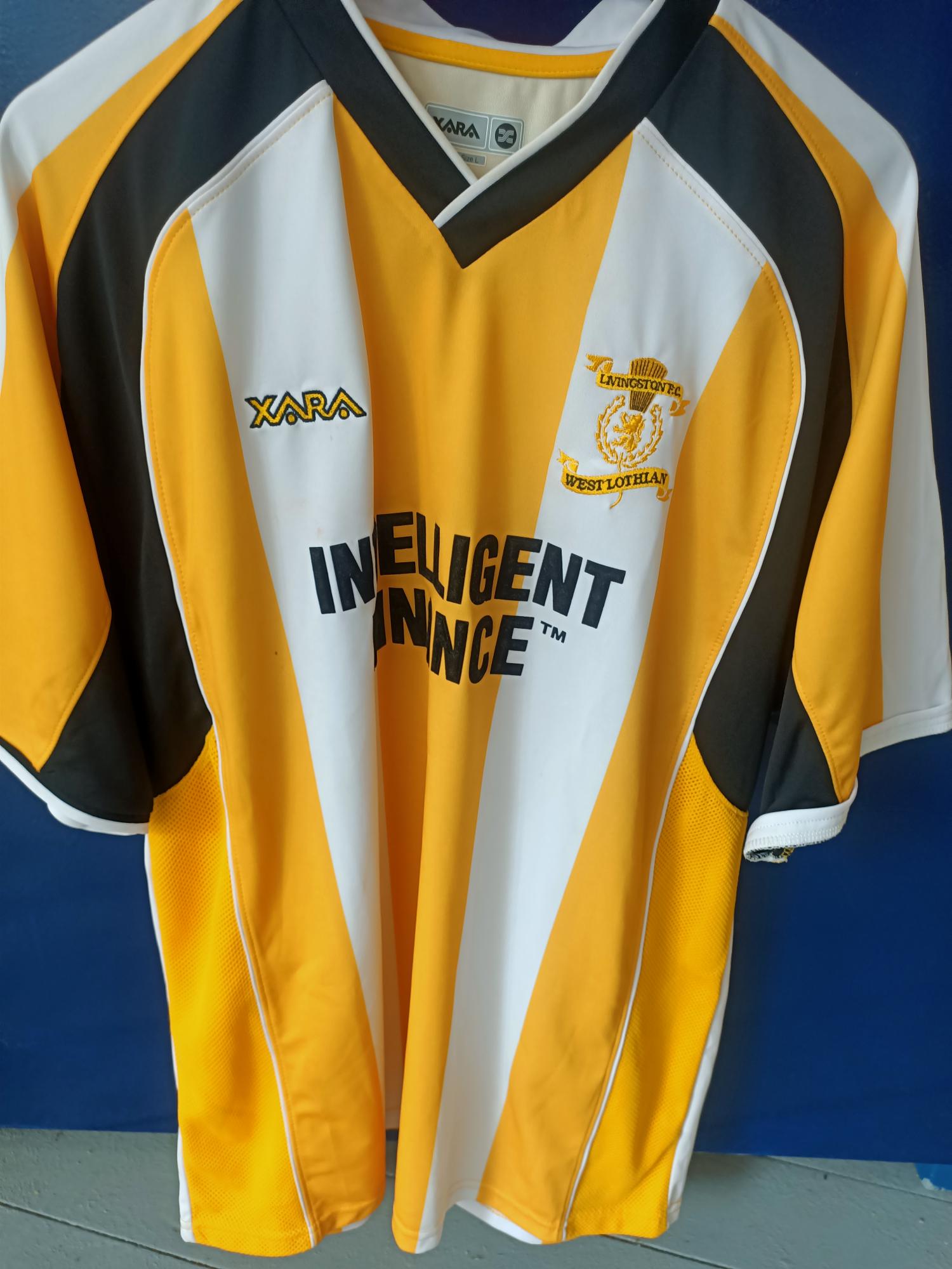 Crafted by Xara, the design features the club’s iconic amber and black colourway, complete with the Livingston crest and sponsor detailing that screams early 2000s football nostalgia.