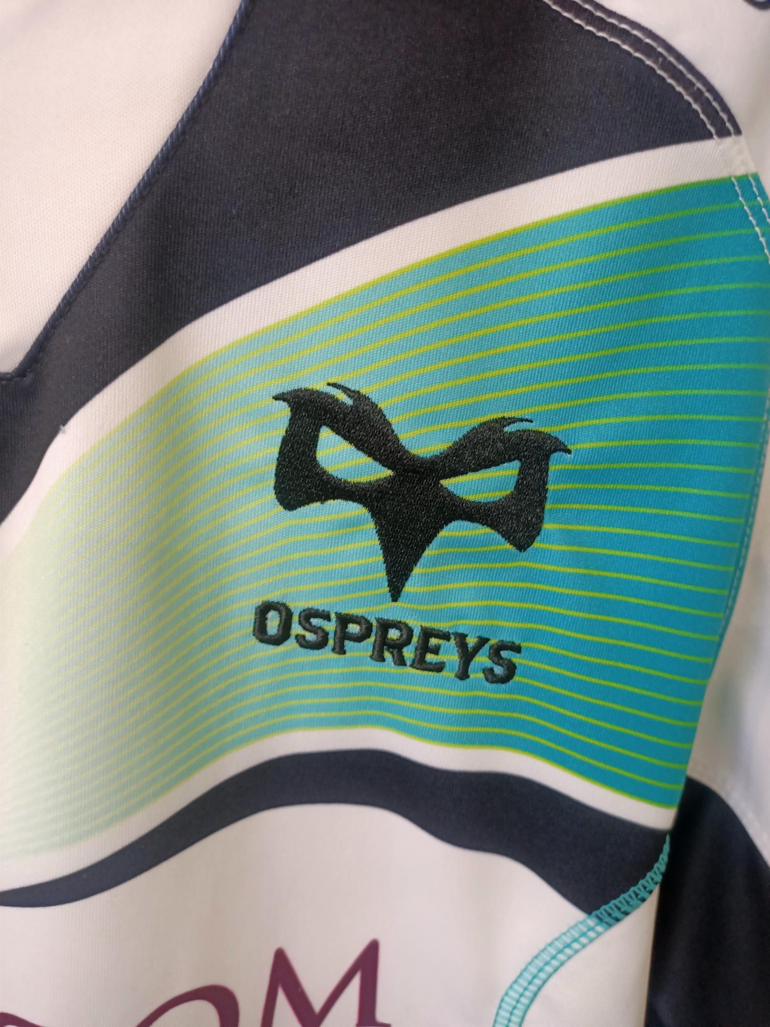 A stylish Ospreys 2016/2017 away shirt, ideal for fans and collectors of Welsh rugby. This distinctive away design stands out from the era and represents the club during the 2016/2017 season.