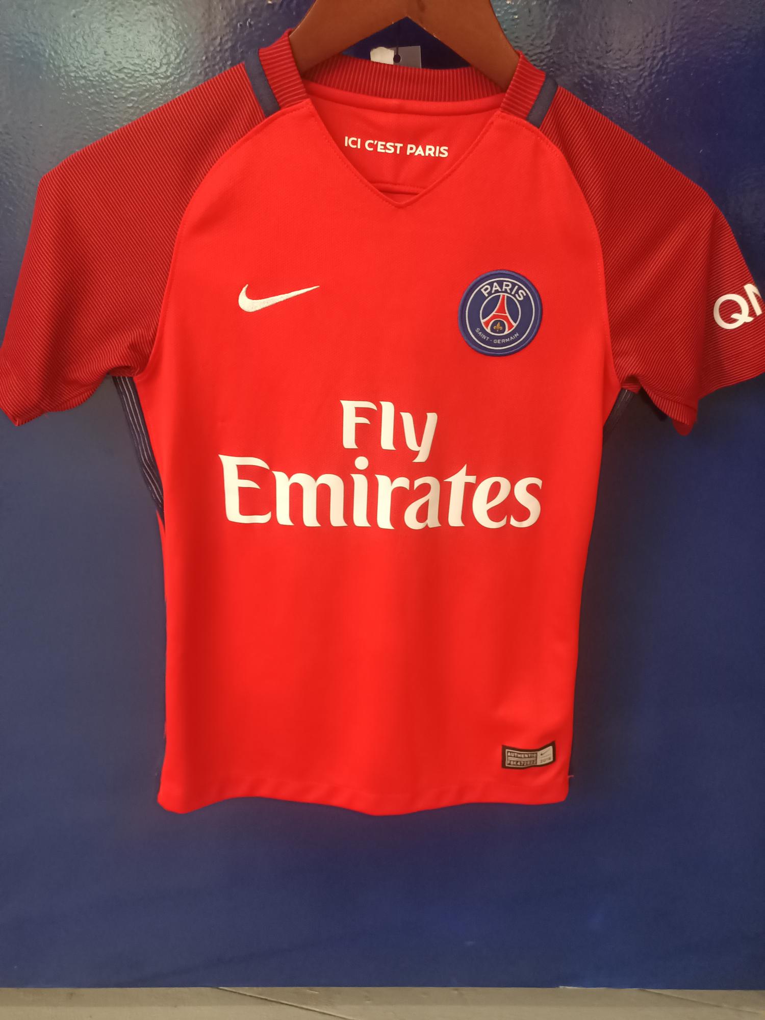 Ignite the passion of young Parisian fans with this PSG 2016/2017 away shirt, a sleek piece from Nike in good pre-loved condition. Designed for small boys in Youth Size 8-10 , this striking white jersey features bold red and navy accents, with the iconic Paris Saint-Germain crest proudly displayed, capturing the flair of the 2016/2017 Ligue 1 season at Parc des Princes. This kit reflects PSG’s dominance and style during a thrilling era.
