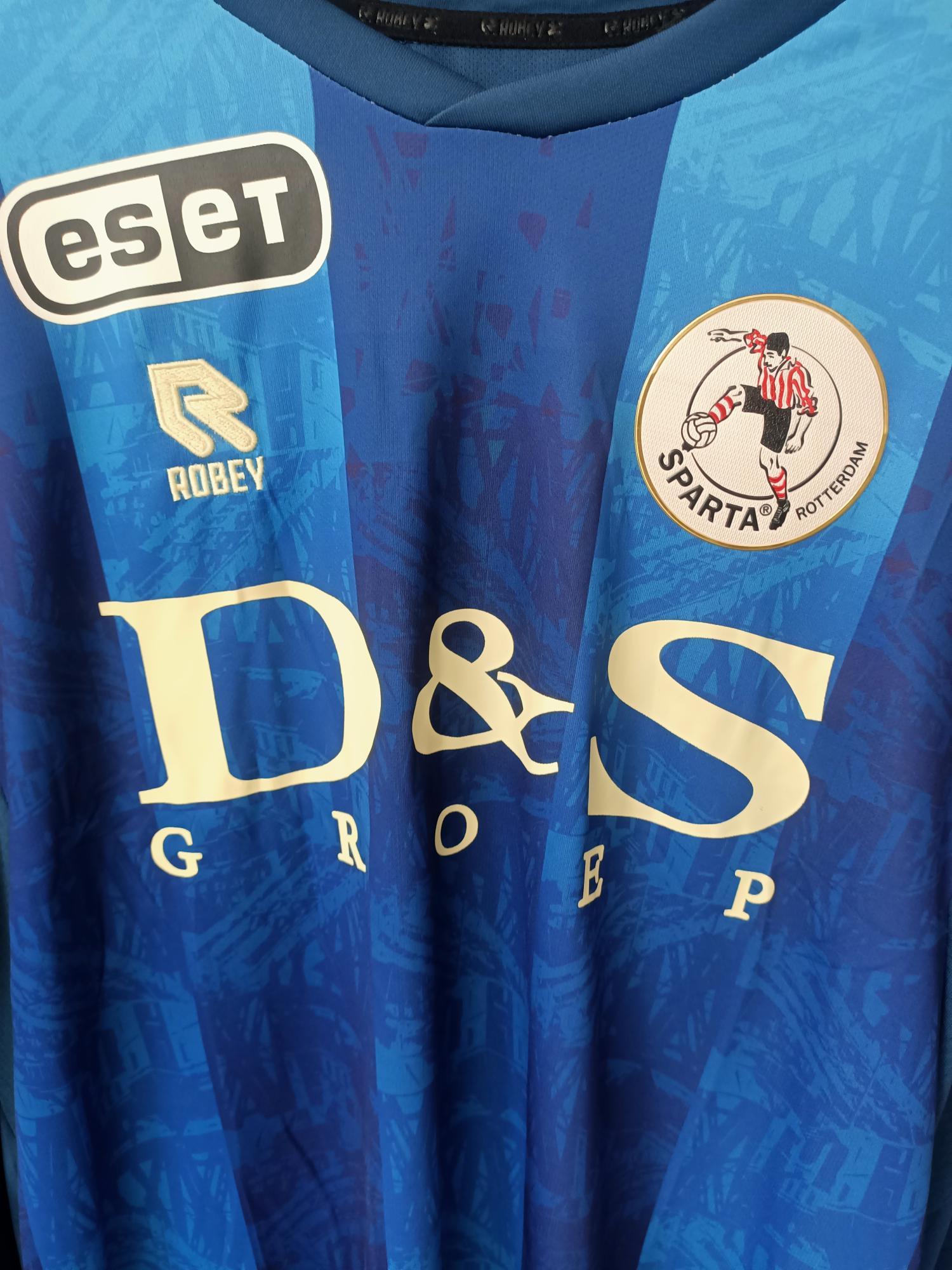 Celebrate the Kasteelheren with this lovely Sparta Rotterdam 2021-2022 away shirt, crafted by Robey in a striking long-sleeve design. Featuring a navy and sky blue gradient with a Het Kasteel graphic, this shirt in great condition is a vibrant tribute to Sparta’s historic legacy and their fight in the Eredivisie. A must-have for fans and collectors to wear or display at Sparta Stadion.